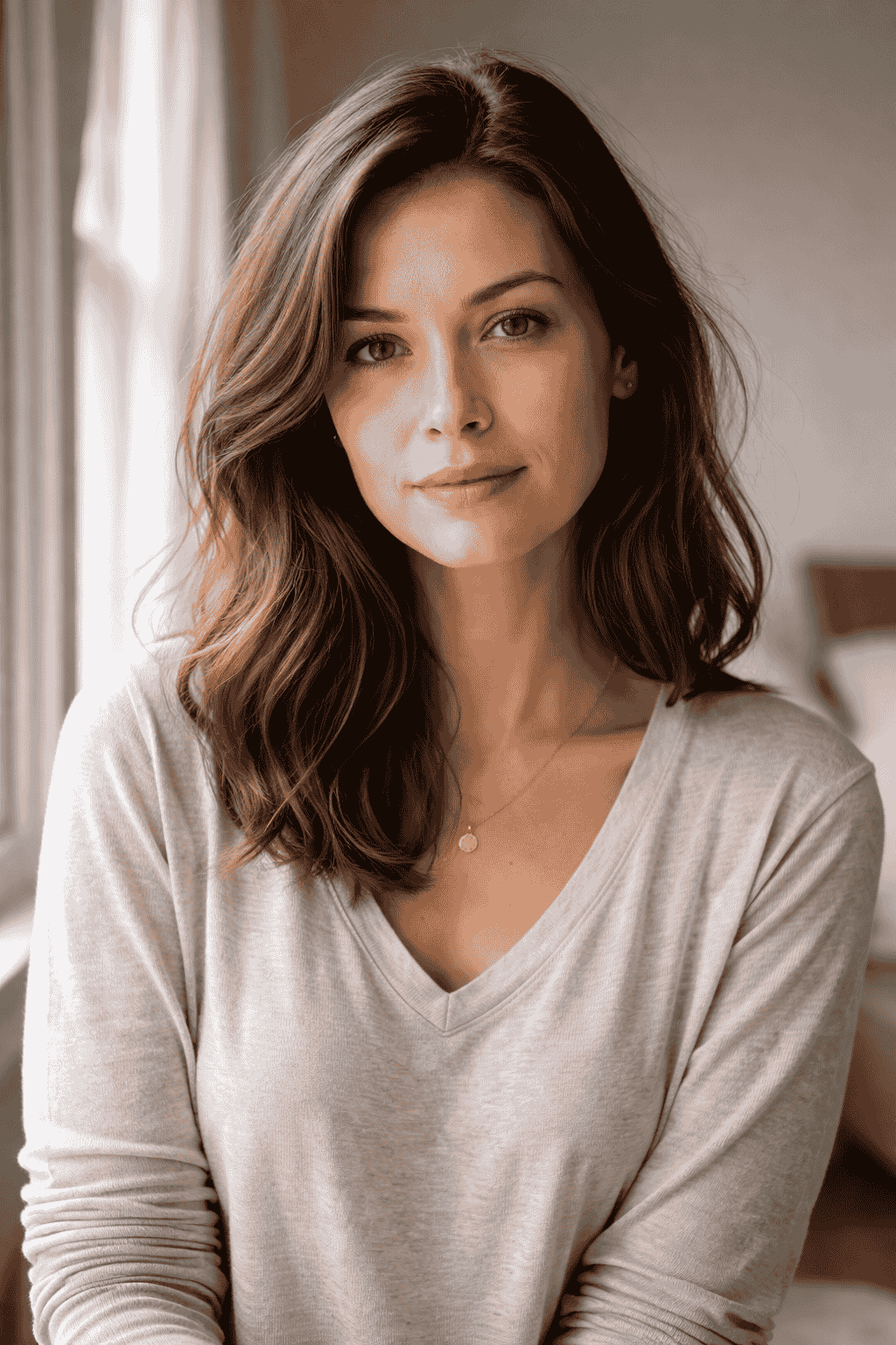 Create a realistic portrait of an adult woman in natural window light, looking directly at the camera, with soft skin texture, natural hair, casual clothing, and a calm expression. Make it look like a real photograph, not an illustration.Copy Prompt